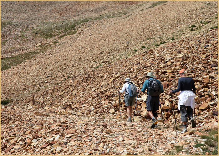 Crossing scree (loose rock), Southeast Ridge trail – Parkview Mountain, Colorado