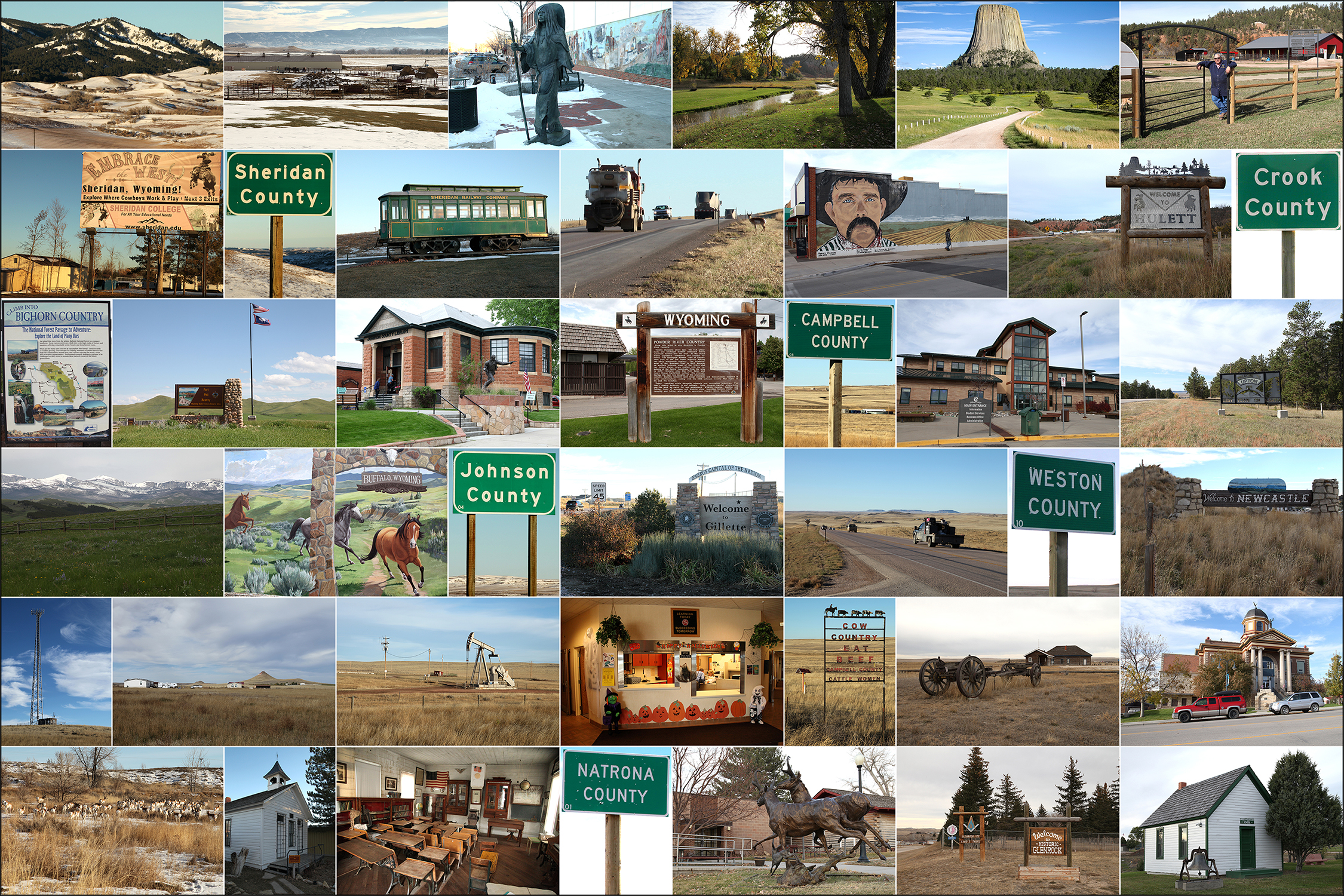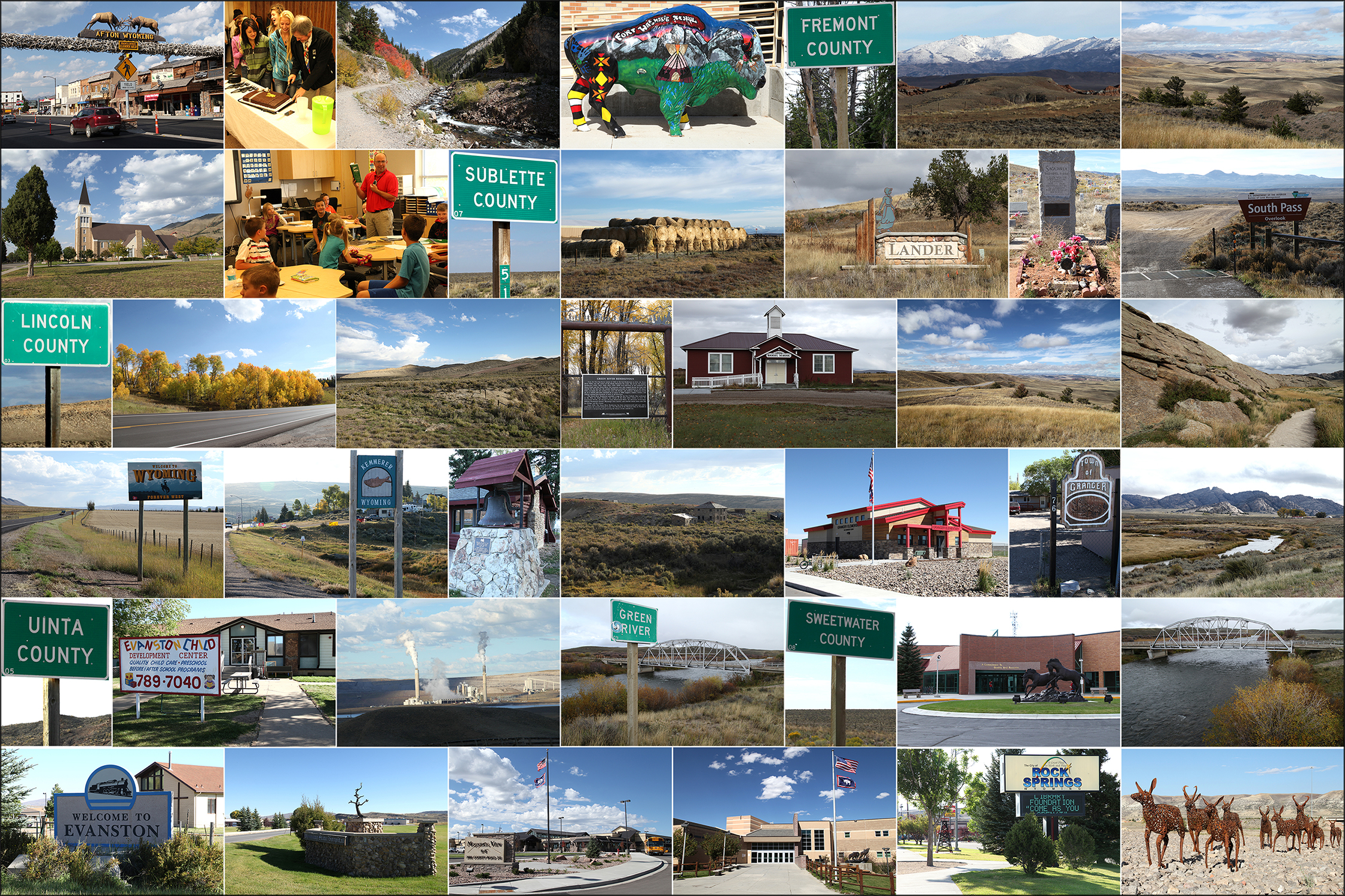 Wyoming23CountyCollage(7.5x5,300blkbord)LabelcpywrtUW College of Education 23 County 100th Anniversary Visits (September 16 – December 11, 2014)