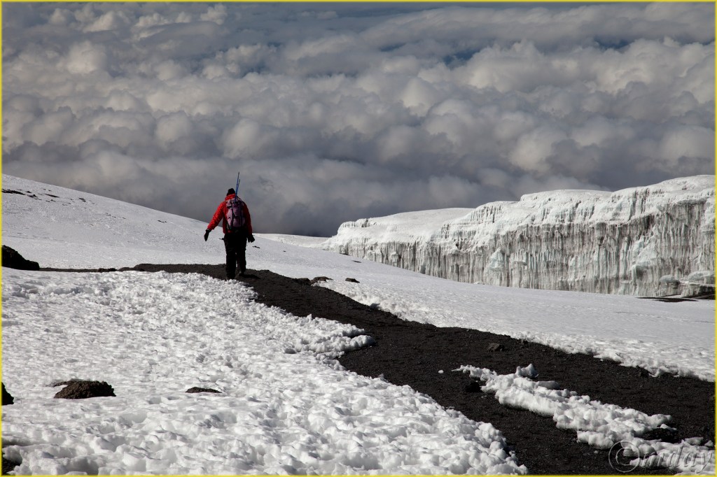 Trail from summit (Uhuru Peak), southern ice field visible on right – Kilimanjaro National Park, Tanzania