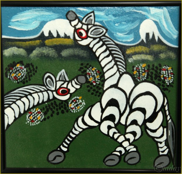 Small tinga tinga painting purchased in Tanzania in 20o9. Two of Kilimanjaro’s peaks are depicted: Kibo on the left (elevation 19, 341 feet) and Mawenzi on the right (elevation 16, 893 feet)