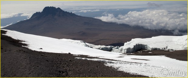 Trail from summit (Uhuru Peak), southern ice field visible on right – Kilimanjaro National Park, Tanzania