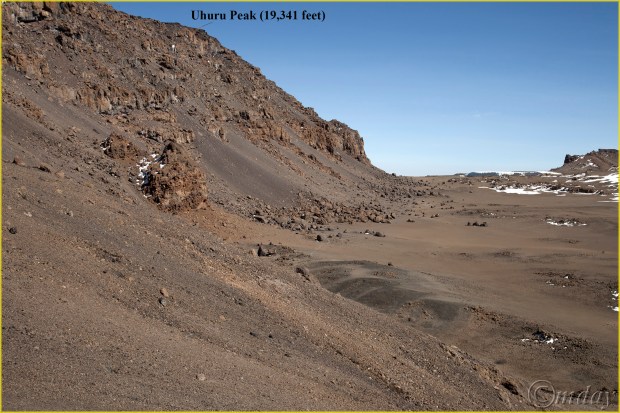 Trail to summit (Uhuru Peak), crater visible on right – Kilimanjaro National Park, Tanzania