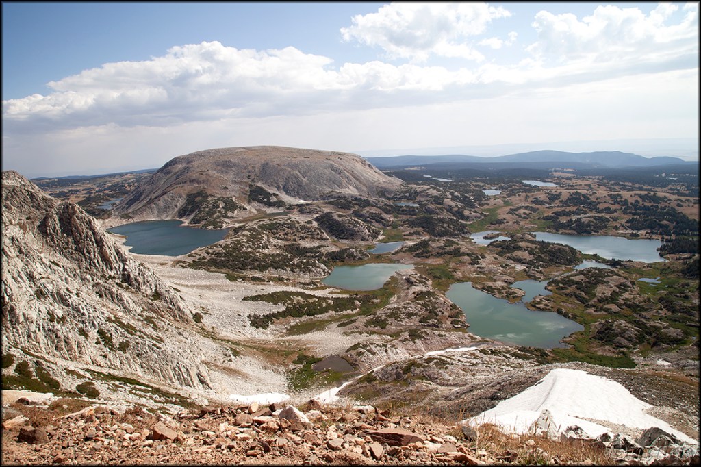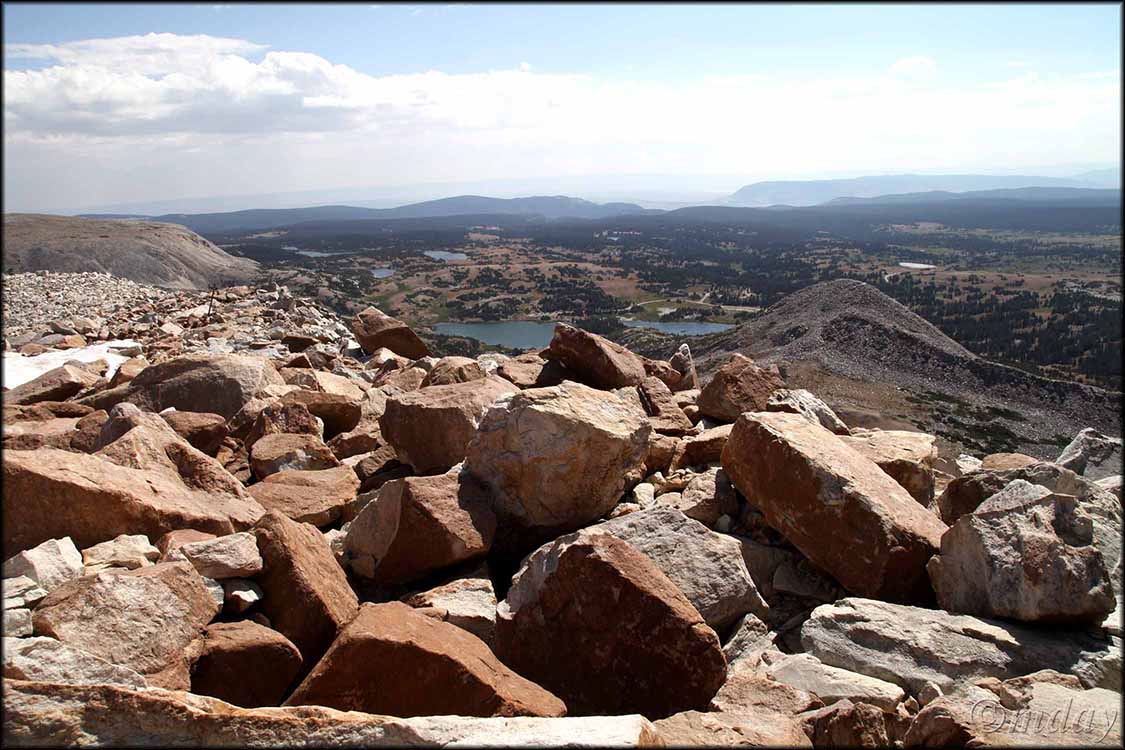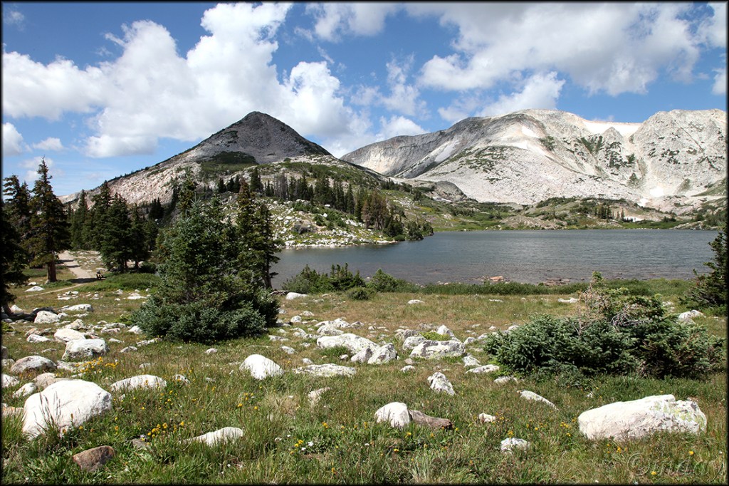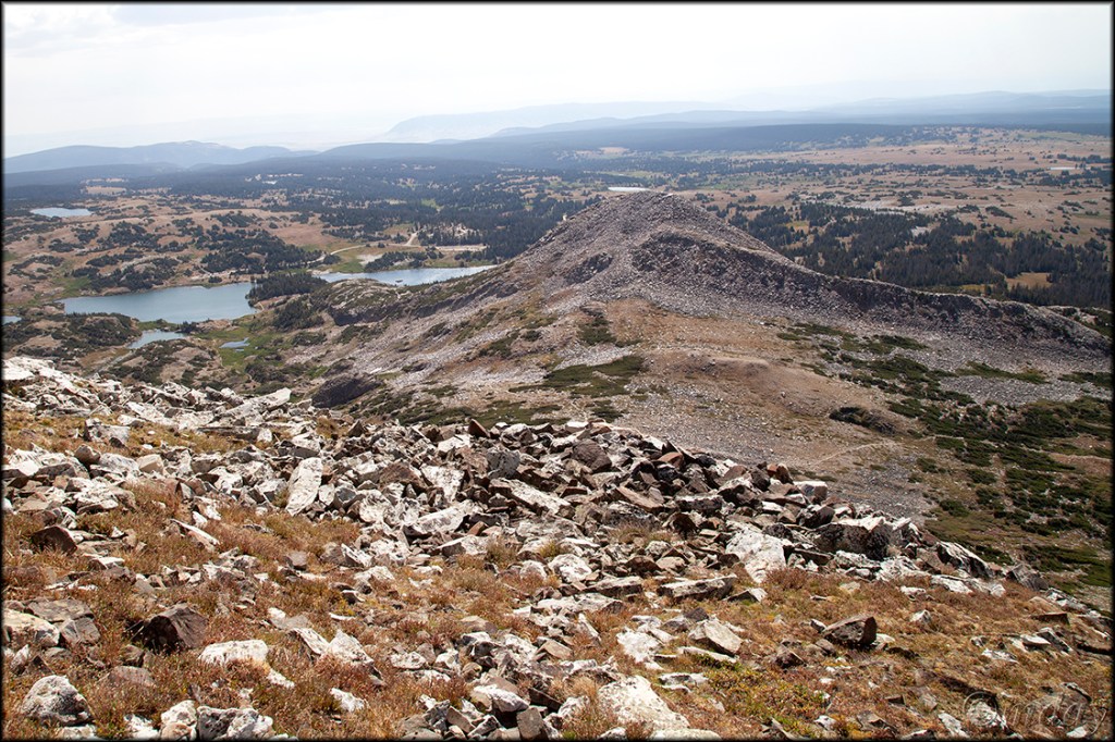 Hope your summer’s going well … only a few days left of our nice warm, snow free weather in Laramie. We’re all good: Sorrel’s healthy and getting her walks to the park most mornings; Susan’s running, playing tennis and soaking in our Sabel pool; and I’m playing pickleball, hiking and photographing wildflowers. But I also had a recent adventure worth sharing here: finally hiking to the summit of Sugarloaf Mountain. (Sugarloaf is one of two mountains in the Snowy Range often overlooked by day hikers; the other is Browns Peak; I plan to focus on both in a future YouTube video.) Located some 41 miles west of Laramie, Sugarloaf is a picturesque cone-shaped, boulder covered mountain most frequently encountered and photographed by visitors to Lewis Lake. For a few years now, I’ve wondered about the best route to reach the summit of Sugarloaf Mountain (elevation 11,398 feet) for a look around. Recently my friend Marty returned to Laramie for a few days and we planned a hike in the Snowies – the hike became an adventurous boulder climb to the summit of Sugarloaf Mountain. Below are a few photos.