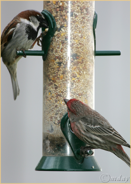 House Sparrow and House Finch at our bird feeder – Laramie, Wyoming