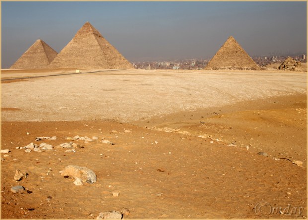 From left to right are the pyramids of 4th Dynasty Kings Khufu (2551-2528 BC), Khafre (2520-2494 BC), and Menkaure (2490-2472 BC) – Giza, Egypt