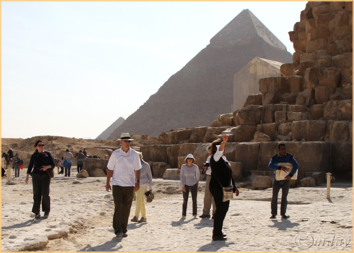 I wouldn’t be surprised if standing before the Great Pyramid of Khufu appears on numerous “bucket-lists” — those lists people make of places to visit or things to do before they die. I don’t have such a list (at least not yet) but I did want to see this marvelous monument again — the only remaining wonder still standing of the “7 Wonders of the Ancient World”. I briefly visited the Great Pyramid in 1970 via a cruise around the Mediterranean Sea, docking in Alexandria and busing to Cairo, some 140 miles or so. I spent the night in Cairo and visited the pyramid early in the morning; it was grand and lived up to my expectation. Also, there were not many tourists then. My recent trip was different: we arrived in the afternoon, the light wasn’t very good, I felt rushed, and there were lots of tourists. Actually this was one of the least satisfying experiences on our itinerary but I can’t really blame our tour company; things had changed. Fortunately, the Great Pyramid is but one of over 130 discovered pyramids in Egypt and during our trip we visited and thoroughly enjoyed several. Many of these monumental tombs remain structural wonders, extending back in time thousands and thousands of years. Below are a few photos.
